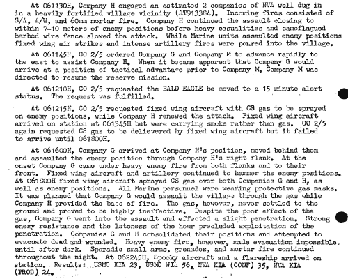 A Note from The Virtual WallOperation ESSEX took place in the Hiep Duc Valley, about 10 kilometers south-southeast of An Hoa. The search and destroy operation resulted from information that elements of the North Vietnamese Army's 21st Regiment were in the area - and they were there in force. The operation kicked off at 8 AM on 06 November 1967 with Hotel 2/5 moving toward Ap Bon hamlet. The following exerpt comes from the 2/5 After-Action Report: