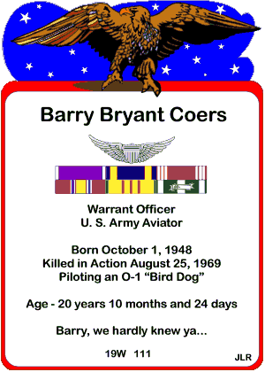 A Note from The Virtual WallTwo men were killed in the crash of an O-1 Birddog observation aircraft - the pilot, WO Barry B. Coers of the 74th Aviation Company, and the observer, SFC Dixon T. Kinard, HQ Btry, 2/35th Artillery, from Honolulu, Hawaii. |