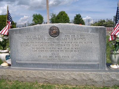 Lance Corporal Thomas E. Creek was my friend and fiance' when he was killed in 1969. I think of him always and miss him every day. He was a sweet young man, probably the most giving individual I ever knew. When he asked me to marry him, I was only 17, and knew he was going overseas to Viet Nam. I told him I would marry him when he came home if he still wanted me. But Tom said he wanted to get married first because he just had this feeling that he wasn't coming back. I became upset and angry with him for saying such a thing. And today I wish I could go back in time and change it all. But you see, so many young men I'd seen go overseas, whether Germany, Korea or Viet Nam, had come back with completely different agendas than when they left. Why? Because they left our precious America as children, and came back MEN. Tom didn't get to come home after all, but I am as proud of him today as I was then. Recently I learned that his little brother, Roy Creek, has passed away, as well as his parents. Oh how his family hurt and paid. Tom has one living older brother, Ross Creek of Amarillo, TX. I just hope Ross and his wife, Kris, know how much Tom was loved - and by so many! HE WILL NEVER BE FORGOTTEN, I PROMISE.