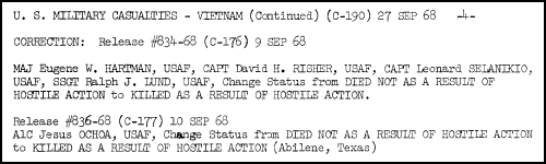 This discrepancy is explained in the Department of Defense casualty reports published at the time. The deaths of the five men were first reported as due to non-hostile causes in DoD press releases 834-68 (09 Sep 68) and 836-68 (10 Sep 68). The post-incident investigation turned up evidence indicating the loss was due to hostile action and the five men were reclassified as killed in action in DoD press release 885-68 (27 Sep 68):