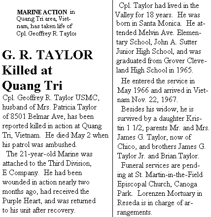 30 December 1946 - 02 May 1968 I remember Jeff Taylor from Cleveland High School in Reseda, California from our school days back in 1964. Jeff was a good buddy to one of my neighborhood friends, Joe English, which is how I came to know Jeff - they both played on Cleveland's varsity baseball team. Not only was Jeff an excellent athlete, but he was a fun loving guy who had many friends - everyone liked Jeff. I'm sure Jeff was a top notch soldier and was well liked by his fellow Marines. A few months after I returned from my tour duty in Viet Nam, I read in the San Fernando Valley Green Sheet Newspaper that Jeff had lost his life. I still have the newpaper clipping and I think of him often.